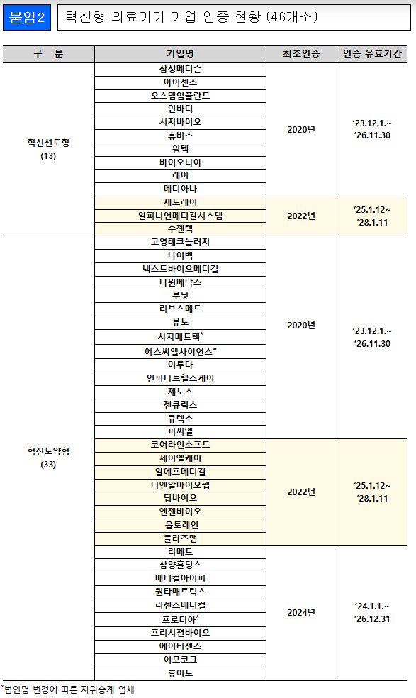 현재까지 혁신형 의료기기 기업으로 인증된 기업은 총 46개사로, 이들 기업은 의료기기 연구개발과 관련된 다양한 정책적 혜택을 통해 시장 진출과 성장을 지속하고 있다.