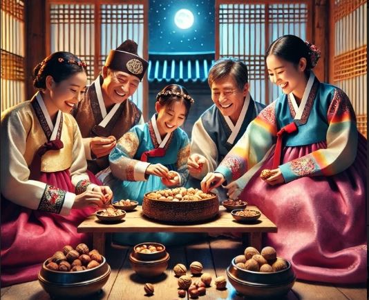 땅콩 역시 건강에 이로운 성분이 풍부하다. 땅콩은 예로부터 ‘낙화생(落花生)’이라고도 불렸으며, 혈액 순환을 개선하고 피로 회복과 호흡기·소화기 건강을 보호하는 데 유익한 것으로 전해진다. 실제 비타민 B군과 ‘레시틴’이라는 성분이 포함돼 두뇌와 신경세포 활성화를 높여주는 견과류로도 꼽힌다. 다만 땅콩은 장기간 실온에 둘 경우 ‘아플라톡신’이라는 발암물질이 형성될 수 있어 밀폐용기에 담아 냉장 보관하는 게 좋다. 정월대보름에 모여 부럼깨기하는 가족의 모습 (출처 자생한방병원이 ChatGPT로 제작)부럼 깨기는 아이들에도 재미있는 풍습이지만 견과류를 비롯한 단단한 음식은 어린 아이들의 치아 건강에 해를 끼칠 수 있어 주의가 필요하다.