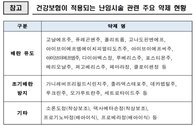 올해 1월부터는 △배란장애에 의한 불임증의 배란유도 △인공수정이나 체외수정 시 배란유도 또는 과배란유도 등으로 급여 범위가 포괄적으로 확대됐다.