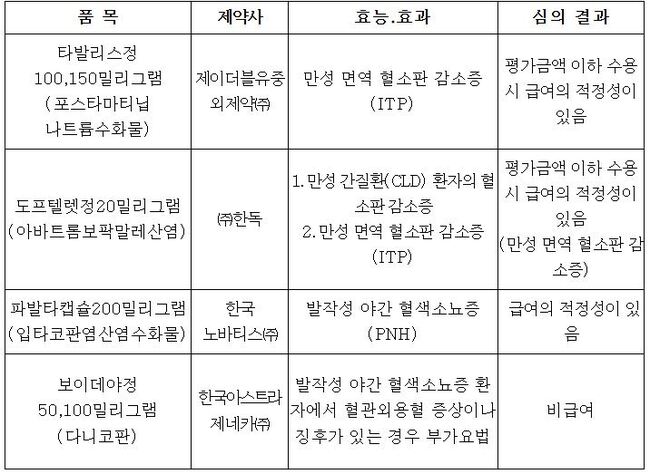 이날 급여 신설 안건으로는 PNH 치료제 파발타와 보이데야, 만성 면역 혈소판 감소증(ITP) 치료제 JW중외제약 ‘타발리스정’(포스타마티닙)과 한독 ‘도프텔렛정’(아바트롬보팍)이 상정됐다.