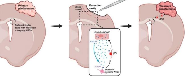 초발 교모세포종(왼쪽)에서는 암 유발 원인인 돌연변이 유전자를 가진 신경줄기세포가 뇌 깊은 곳에서 위치함. 초발 종양을 수술로 제거해도(중앙) 혈관내피세포가 분비하는 신호가 신경줄기세포를 자극하여 재발 부위로 이동을 촉진함. 재발 교모세포종(오른쪽)에서는 이동한 신경줄기세포가 재발암을 형성함.