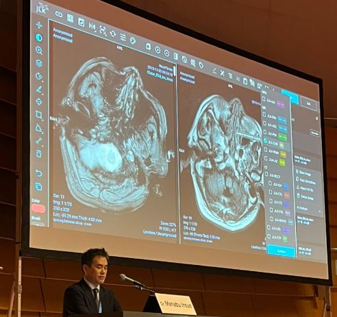 이노우에 마나부 교수가 지난달 일본 오사카에서 열린 ‘STROKE 2025 JAPAN’에 참가해 제이엘케이의 뇌졸중 인공지능 진단 시스템을 소개하고 있다.