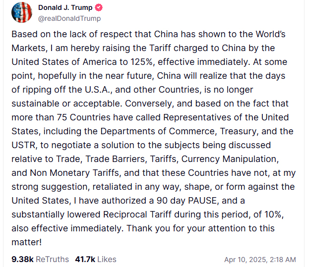 그러나 바로 다음날이자 상호관세 부과 적용일인 9일 자신이 설립한 소셜 미디어 플랫폼 Truth Social통해 재보복 대응한 중국에만 관세를 125%로 상향조정하고 나머지 국가의 경우 상호관세를 90일간 일시 유예 한다고 밝히며 우려가 일부 해소되는 분위기다.