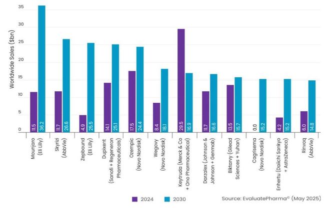 2024년 매출 1위 제약사인 미국 존슨앤드존슨은 4위로 떨어지고, 1위 처방약인 면역항암제 미국 머크(MSD)의 ‘키트루다’(펨브롤리주맙)는 7위로 떨어질 것이란 예상이다.