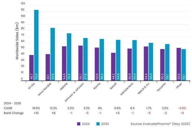 이같은 의약품 매출 동향에 따라 2030년 글로벌 제약사 매출 1위는 릴리로 1126억달러를 기록할 전망이다. 이는 화이자나 노바티스의 두 배에 육박하며, 성장세는 모든 경쟁사를 압도할 것으로 전망된다.