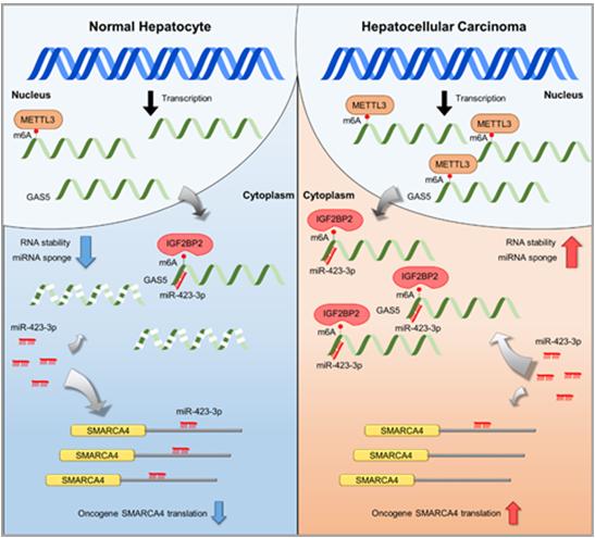 간세포암에서 GAS5는 miR-423-3p를 흡착해 종양 억제 유전자인 SMARCA4 mRNA와의 결합 작용을 방해해 간암 발생을 유도함.