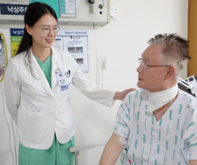 서울대병원 의료진은 환자의 상태를 종합적으로 판단한 끝에 지난달 19일 로봇 폐이식 수술을 결정하고 시행했다. 갈비뼈 사이를 최소한으로 절개하고 로봇 팔을 이용해 손상된 폐를 제거한 뒤, 기증 폐를 정밀하게 이식하는 방식으로 약 8시간에 걸쳐 수술을 진행했다. 현재 환자는 산소 공급 없이도 자연 호흡이 가능할 정도로 빠르게 회복 중이다.   국내 최초로 로봇 폐이식을 집도한 박샘이나 서울대병원 심장혈관흉부외과 교수(왼쪽)와 수술을 받은 윤병섭 환자