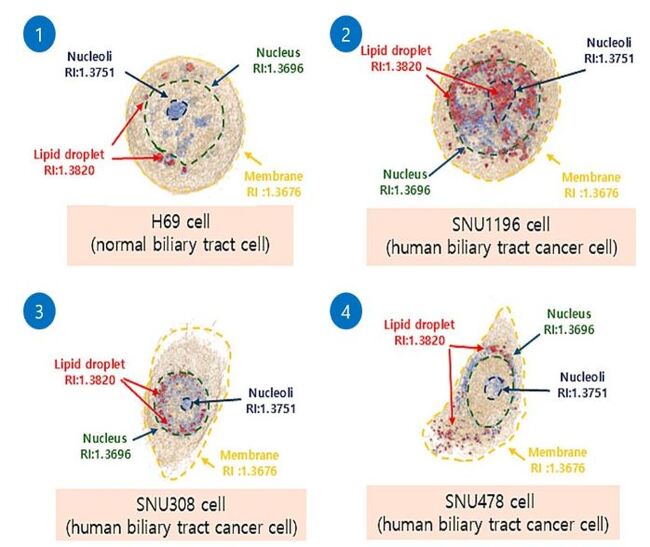 이 연구는 ‘AI 기반 3D 광회절단층촬영을 활용한 담관암 진단 강화(Enhancing biliary tract cancer diagnosis using AI-driven 3D ODT)’ 제목으로 SCIE급 국제 학술지인 ‘Methods’[피인용지수(IF): 4.3] 2025년 6월호에 게재됐다. 담관암 세포와 정상세포의 3D ODT 영상이미지 차이: 1번 정상세포와 비교해 2~4번 담관암 세포는 지질 방울(Lipid Droplet, 붉은색)이 밀집되고 불균일한 분포를 보인다.