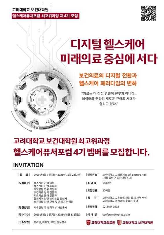 고려대 보건대학원은 디지털 헬스케어 산업의 변화와 혁신을 선도할 차세대 리더 양성을 위한 ‘헬스케어퓨처포럼 4기’ 최고위과정 수강생을 모집한다.