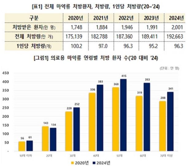 정부가 마약류통합관리시스템(Narcotics Information Management System, NIMS)으로 관련 통계를 수집한 2018년 이후 2023년에 이어 2024년에도 역대 최다 수치를 기록했다. 40대부터 60대까지의 처방 환자 수가 전체의 59.5%(1,191만명)를 차지해 중장년층의 의료용 마약류 사용이 집중된 모습을 보였다.