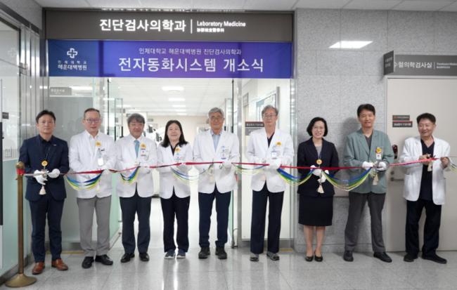 김성수 인제대 해운대백병원장과 직원들이 최첨단 검사실 자동화 시스템 도입 개소식을 갖고 기념촬영을 하고 있다.