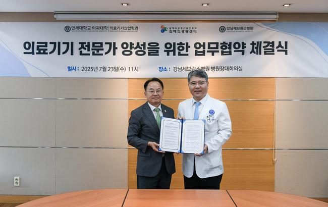 연세대 강남세브란스병원과 연세의대 의료기기산업학과가 지난 23일 김해의생명산업진흥원과 의료기기 전문가 양성을 위한 업무협약을 체결했다고 밝혔다.