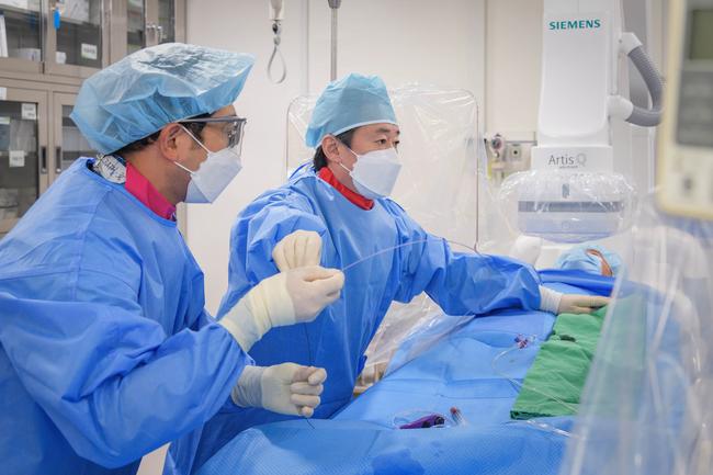 김희열 부천성모 순환기내과 교수(오른쪽)가 심혈관중재술을 하고 있다.