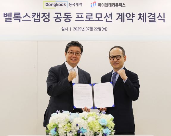 송준호 동국제약 대표(왼쪽), 박종덕 아이엔테라퓨틱스 대표가 벨록스캡정 공동 마케팅 계약을 체결하고 있다. 동국제약 제공 동국제약은 대웅제약의 자회사 아이엔테라퓨틱스와 위식도역류질환 치료제 ‘벨록스캡정’에 대한 공동 프로모션 계약을 체결하고, 국내 독점 유통 및 판매를 진행한다.