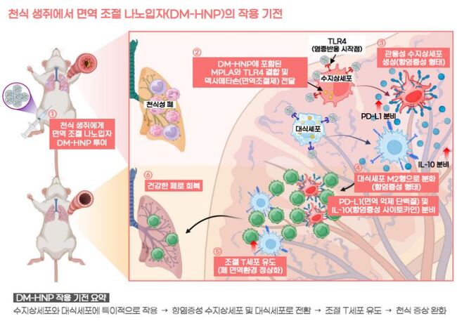 알레르기성 천식 생쥐에게 DM-HNP를 투여한 결과, TLR4를 높게 발현하는 수지상세포와 대식세포에만 선택적으로 결합되는 것을 확인했다. 이후 수지상세포는 면역반응을 억제하고 염증 무반응 상태를 유도하는 관용성 수지상세포로 분화됐다. 대식세포 역시 항염증 작용을 하며 조직 재생, 면역 억제, 조절 T세포(면역 항상성 유지 및 과도한 면역반응 억제) 유도에 관여하는 M2 대식세포로 분화된 모습이 관찰됐다.