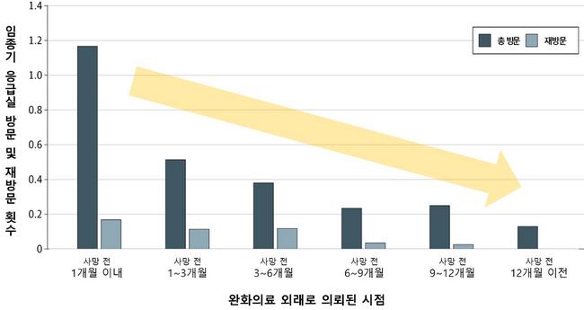 구체적으로, 응급실 방문 및 재방문 횟수는 ‘사망 전 1개월 이내에 완화의료 외래로 의뢰된 환자’에서 가장 많았고, 의뢰 시점이 빠를수록 줄어드는 경향이 있었다. 사망을 기준으로 완화의료 외래 의뢰가 1개월씩 빨라질수록 임종기 응급실 방문 가능성은 16% 줄어드는 것으로 나타났다.