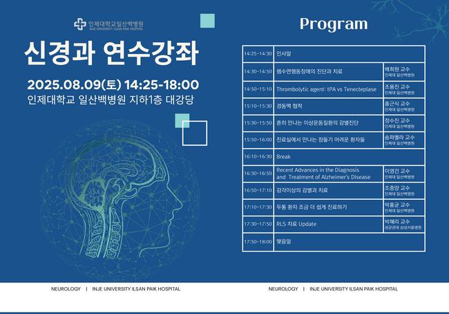 인제대 일산백병원은 8월 9일 오후 2시 25분부터 병원 지하 1층 대강당에서 지역 개원의와 의료진을 대상으로 ‘2025 신경과 연수강좌’를 개최한다.
