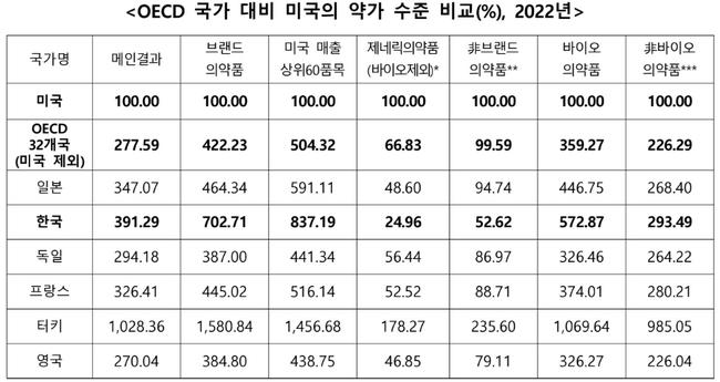 이에 따르면 미국의 약가는 경제협력개발기구(OECD) 32개국 대비 2.78배 높고, 한국보다 3.9배 높은 것으로 나타났다.