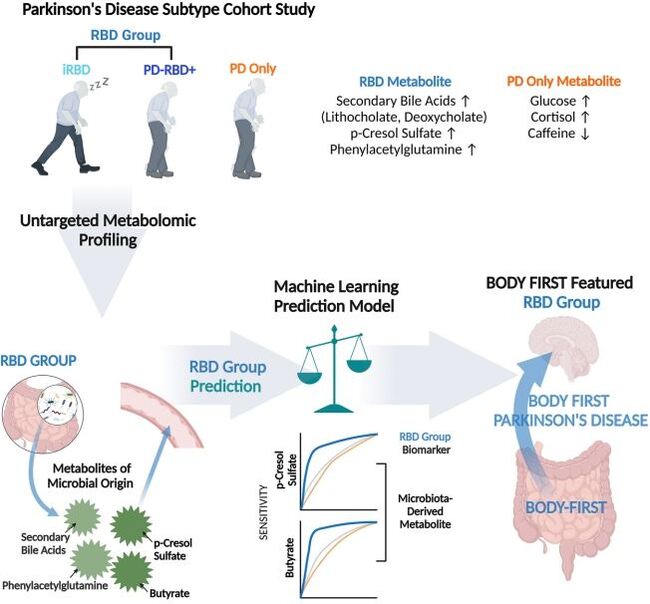 분석 결과, RBD 동반 파킨슨병군과 특발성 RBD군에서 장내 미생물에서 유래한 대사체인 p-크레솔 황산염, 2차 담즙산, 페닐아세틸글루타민 등이 증가한 사실을 확인했다. 이는 RBD 동반 파킨슨병이 ‘몸에서 시작되는(body-first)’ 유형과 관련이 있음을 시사한다. 즉, 장내 미생물의 변화가 파킨슨병 발병에 중요한 역할을 하며, 장-뇌 축(gut-brain axis) 이론에 기반해 장과 뇌가 서로 영향을 미치는 방식으로 병이 진행된다고 볼 수 있다.