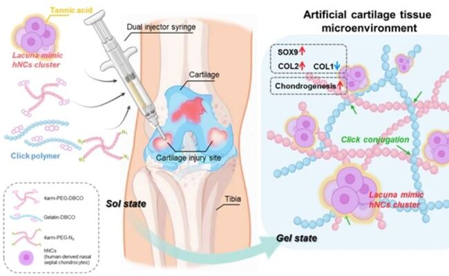 연구팀은 이 세포-하이드로겔 복합체를 연골이 손상된 쥐 모델에 이식한 결과, 우수한 연골 재생 효과를 확인했다. 면역조직화학적 분석에서도 실제 연골에 가까운 조직이 형성된 것이 관찰됐다. 사람 유래 비중격 연골세포와 클릭 화학 기반 하이드로겔 이용한 연골의 라쿠나 구조를 모사한 연골 재생 기술 모식도 이번 연구는 무릎 연골의 외상성 손상, 퇴행성 질환으로 고통받는 많은 환자들에게 희망적인 치료의 단초가 될 전망이다. 하이드로겔과 세포 클러스터를 결합한 이번 방식은 실제 환자 치료로 이어지기까지 전임상-임상-상용화의 중개연구를 거쳐야 한다.
