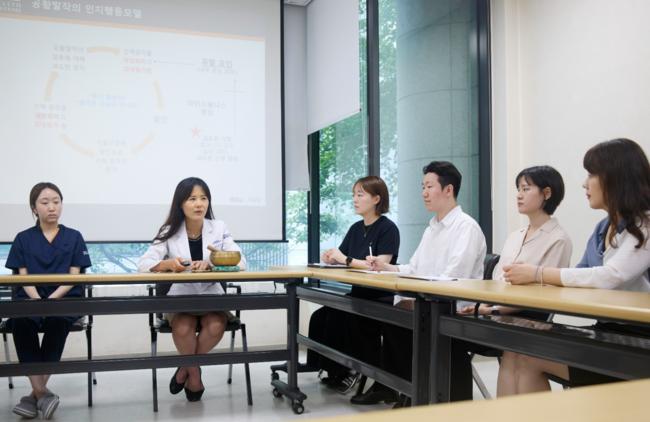 김현주 분당차병원 정신건강의학과 교수(왼쪽 두번째)가 마음챙김 인지치료를 하고 있다.