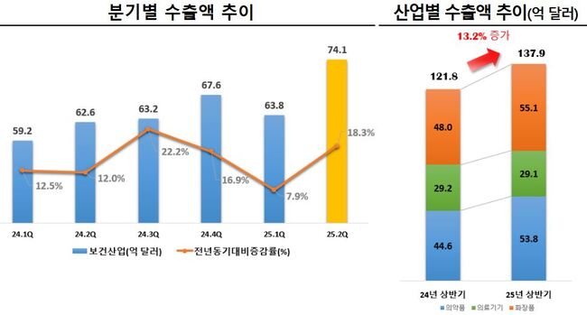 미국 시장을 중심으로 바이오의약품, 기초화장품 수출이 크게 증가하며 의약품과 화장품 분야에서 역대 반기 최대 실적을 달성했다. 반면 임플란트 등 치과용품 수출 감소로 의료기기 수출은 전년 동기 대비 소폭 줄었다.