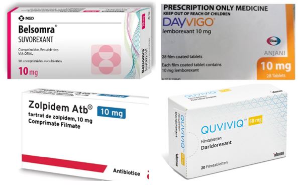 OX1은 급속안구운동(REM) 수면의 시작을 억제하고, OX2는 비급속안구운동(NREM, 非REM) 수면의 시작을 억제한다. 렘수면은 꿈꾸는 수면이고, 비REM수면은 1~2단계의 얕은 수면, 3~4단계의 깊은 수면으로 나뉜다. 비REM수면은 전체 수면의 75~80%를 차지하고 육체 피로 회복에 밀접한 수면이다. REM수면은 낮동안의 불필요한 정보를 정리하고, 감정을 처리하며, 기억을 강화하는 등 정신의 피로를 회복하는 데 필요한 수면이다. 불면증 치료제인 DORA 계열의 ‘벨솜라’(윗줄 왼쪽부터 시계방향) ‘데이비고’ ‘큐비빅’과 GABA 작용제인 ‘졸피뎀’