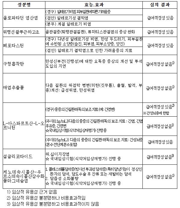 • 재평가서 애엽추출물·구형흡착탄·설글리코타이드·케노데속시콜린산 등 5개 성분 ‘급여 적정성 없음’ 판정