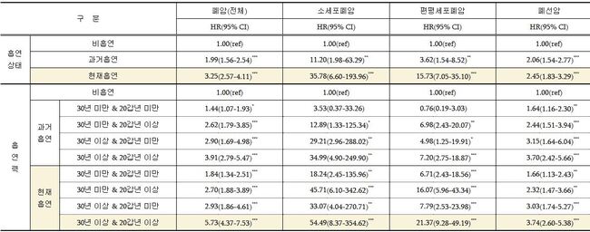 국민건강보험공단은 11일 이같은 연구결과를 발표하고 현재 진행 중인 담배회사들과 소송에서의 승리에 유리한 요소로 작용할 것으로 기대했다. 흡연상태 및 흡연력에 따른 암 발생위험도: 전체 폐암, 소세포폐암, 편평세포폐암, 폐선암 대상
