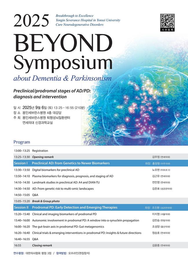 연세대 용인세브란스병원은 오는 9월 6일 대강당에서 ‘2025 BEYOND 심포지엄’을 개최한다. 퇴행성뇌질환센터와 연세의대 신경과학교실이 주관하는 이번 행사는 알츠하이머병과 파킨슨병의 전임상·전구기 진단 및 조기 중재 전략을 주제로 진행된다.