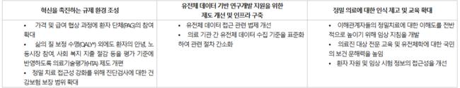 보고서는 한국이 정밀의료 선진국가로 도약하기 위해서는 △복잡한 약가 및 급여 체계 개선 △유전체 데이터 활용 규제 완화 및 인프라 확충 △정밀의료에 대한 의료진·환자 인식 제고 등이 필요하다고 제시했다.