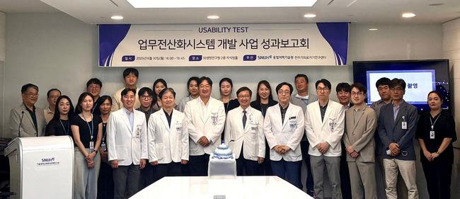 서울대병원 UPs 개발 사업 성과보고회 기념사진. 김영태 병원장(왼쪽 6번째), 이활 융합의학기술원장(왼쪽 7번째)