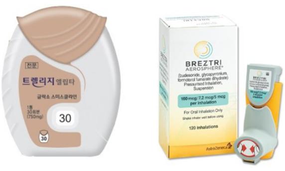 이번 연구는 후향적 코호트 분석으로, 2제요법으로 치료를 받다가 단일 흡입기 3제요법(SITT)으로 단계를 올린 COPD 환자를 대상으로 FF/UMEC/VI와 BUD/GLY/FORM(아스트라제네카(AZ)의 ‘브레즈트리 에어로스피어흡입제’)의 효과를 비교한 리얼 월드(Real-World) 연구 결과다.   COPD 3제 복합 흡입제인 한국GSK의 ‘트렐리지 엘립타 100’(왼쪽)와 한국아스트라제네카(AZ)의 ‘브레즈트리 에어로스피어흡입제’