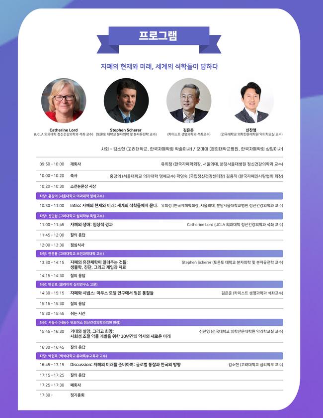 첫 세션에서는 캐서린 로드 UCLA 의대 교수가 자폐 진단 도구와 임상 경과 연구를, 스티븐 쉬어러 토론토대 교수가 유전체 분석을 통한 진단 및 개입 가능성을 소개한다. 이어 국내 연구진도 참여해 자폐 관련 뇌과학 연구와 약물 개발, 사회적 지원 방향을 발표한다.