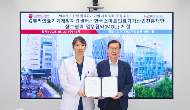 고려대구로병원 G밸리의료기기개발지원센터가 8월 20일 한국스마트의료기기산업진흥재단과 업무협약(MOU)을 체결했다. 협약식에는 용환석 고려대구로병원 교수와 허영 재단 부이사장 등 양 기관 관계자들이 참석해 의료기기 산업 발전을 위한 협력 방안을 논의했다.