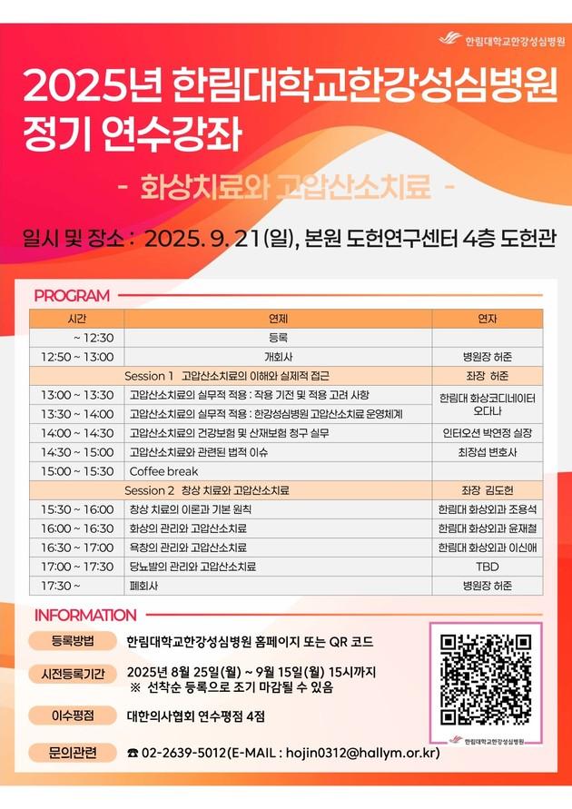 한림대한강성심병원이 오는 9월 21일 도헌연구센터에서 화상치료와 고압산소치료를 주제로 정기 연수강좌를 개최한다. 이번 강좌는 병원의 핵심 진료 분야인 화상 및 고압산소치료의 임상 경험과 최신 지견을 공유하기 위해 마련됐다.