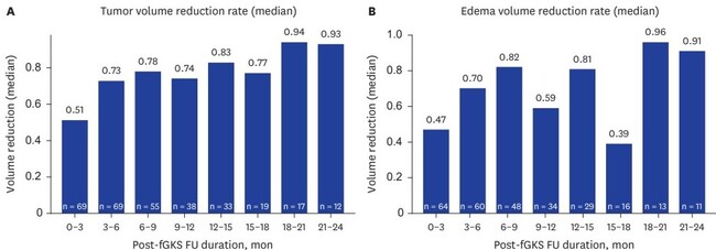 연구팀은 또 2년간 3개월 간격으로 종양 및 부종 부피, 신경학적 증상, 방사선 독성을 평가한 결과 종양 10개 중 8개는 부피가 절반 이상으로 감소했고, 종양의 부피가 최대로 줄어드는 데 걸린 시간은 중앙값 3.3개월이었다. 종양 및 부종의 부피는 치료 후 6~9개월까지 지속적으로 감소해 약 80% 줄어들었다. 이어서 18개월까지 일시적인 부피 변동이 있었지만, 18개월부터는 안정적으로 유지됐다. 이 결과는 분획 감마나이프 방사선 수술이 종양 뿐 아니라 주변 부종까지 줄여 신경학적 증상을 완화할 수 있음을 시사한다. 실제로 전체 환자의 87.1%는 수술 후 6개월 이내에 신경학적 증상이 안정 또는 개선됐다.