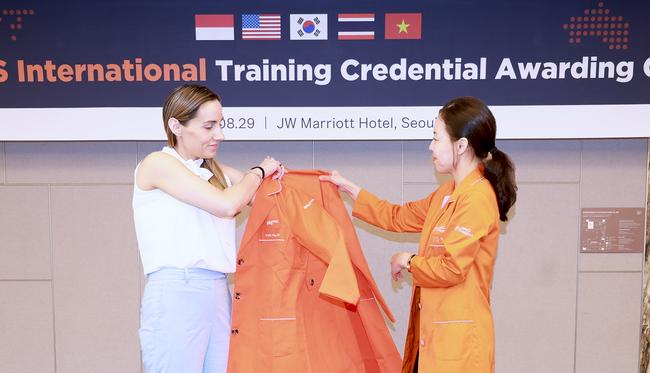 미국 의료진 교육 수료식 중 김정은 365mc올뉴강남본점 대표원장이 365mc LA점 앤지 트리아스 산체스 대표원장에게 오렌지가운을 전달하고 있다.