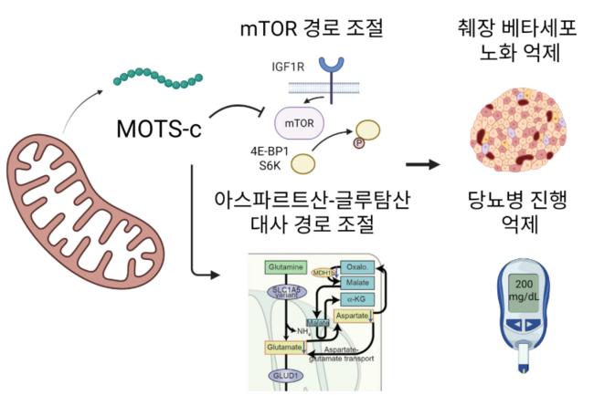 추가적으로 기전 연구를 통해 연구팀은 MOTS-c가 췌도세포의 mTOR 신호경로와 아스파르트산–글루탐산 대사 경로를 조절한다는 사실을 밝혔다. 두 경로는 세포 성장과 대사에 중요한 역할을 하지만, 이상이 생기면 세포 노화를 촉진한다.