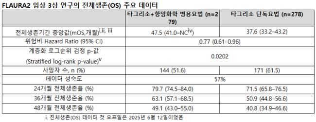 타그리소 병용요법군의 전체생존기간 중앙값(mOS)은 약 4년(47.5개월)으로, 이는 타그리소 단독요법군의 약 3년(37.6개월) 대비 생존기간이 연장됐다. 데이터 성숙도 57% 기준 분석에서, 병용요법은 단독요법 대비 사망 위험을 23% 낮췄다(HR 0.77; 95% CI: 0.61–0.96; p=0.02).