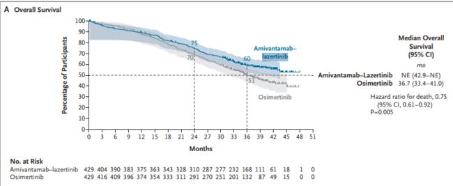 이번 연구논문은 3가지 요법의 전체생존기간을 비교한 것으로 각각 429명의 환자가 아미아미반타맙-레이저티닙 또는 오시머티닙을 투여받도록 배정됐다. 중앙값 37.8개월의 추적 관찰 기간에 아미반타맙-레이저티닙은 오시머티닙보다 전체생존기간(OS)이 유의하게 길었다(사망 위험비, 0.75; 95% 신뢰 구간, 0.61~0.92; P=0.005). 전체생존기간 중앙값은 병용요법이 42.9개월 이상(데이터 미성숙으로 인한 최종 결과 미도출)인 반면 오시머티닙 단독요법은 36.7개월(35.4~41.0개월)로 산출됐다. 즉 병용요법의 사망위험이 25% 낮게 나타났다.