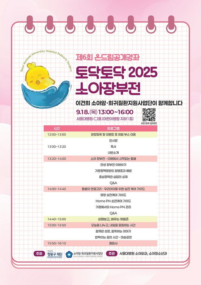 서울대병원 소아암·희귀질환지원사업단이 오는 18일 오후 1시 서울대어린이병원 CJ홀에서 '토닥토닥 2025 소아장부전' 공개강좌를 개최한다.