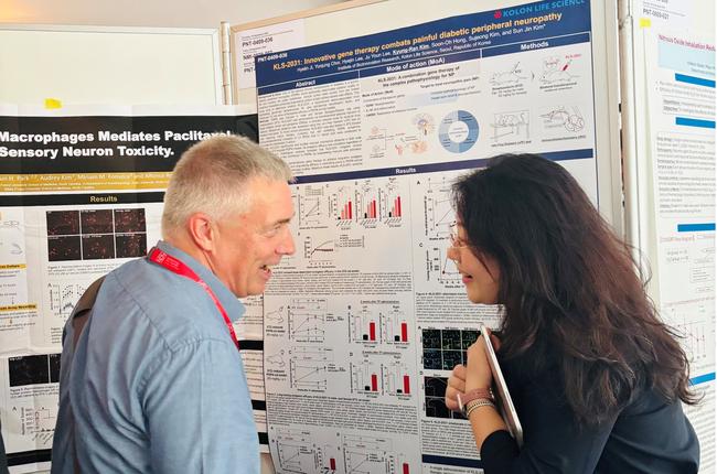 코오롱생명과학 연구진이 국제 신경병증성 통증전문 학술대회 'NeuPSIG 2025'에서 유전자 치료제 후보물질 'KLS-2031'의 당뇨병성 말초신경병증(PDPN) 전임상 연구 결과에 대해 포스터 발표를 하고 있다.
