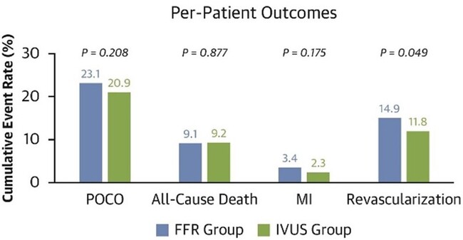 분석 결과, 1차 평가지표인 주요심장사건 발생률(사망, 심근경색, 재관류술)은 두 군에서 유의미한 차이가 없었다(분획혈류예비력 23.1% vs 혈관내초음파 20.9%). 특히 사망과 심근경색 각각의 발생률도 두 군에서 차이가 없어, 장기적으로 동등한 임상 효과를 보였다.