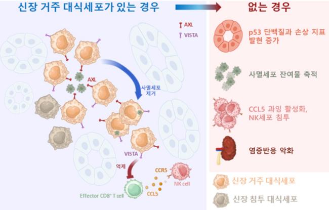 즉, 신장 거주 대식세포는 신장의 다른 대식세포와 달리 AXL 및 VISTA 단백질을 특이적으로 발현하며, 이를 통해 각각 사멸세포를 효과적으로 제거하고 염증반응을 완화함으로써 신장의 면역 항상성을 유지하는 중요한 역할을 담당했다.
