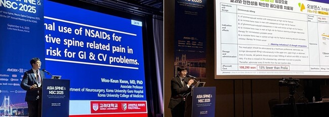 권우근 고려대 구로병원 신경외과 교수(왼쪽)와 고명진 중앙대병원 신경외과 교수가 지난 5일 대한척추신경외과학회 ‘제39차 국제 추계 학술대회’에서 각각 근골격계질환 ㅊ료제인 ‘낙소졸’과 ‘오보덴스’의 최신 연구 동향과 치료 전략을 발표하고 있다. 이후 런천 세션에서 발표를 맡은 고명진 중앙대병원 신경외과 교수는 한국인이 포함된 글로벌 3상 임상을 통해 안전성 및 유효성을 확인한 ‘오보덴스’의 임상적 이점에 대해 발표했다.