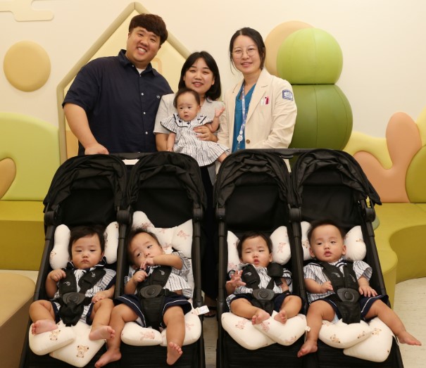 지난해 9월 20일 가톨릭대 서울성모병원에서 탄생한 다섯쌍둥이가 이들의 분만을 담당했던 홍수빈 산부인과 교수와 1년 만에 건강한 모습으로 재회했다. 미숙아로 세상에 나오자마자 2개의 신생아 중환자실에 나눠 입원하는 등 천신만고를 겪었다.