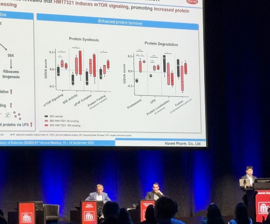 이번 학회에서는 전해민 한미약품 R&D센터 임상이행팀장(상무)은 구연 세션에서 HM17321을 투약한 동물 모델의 근육 단백체 연구를 통해 분자생물학적으로 근육 증가 기전을 규명하고, 대사 적응을 통한 혈당 조절 효과를 입증한 결과를 발표했다.