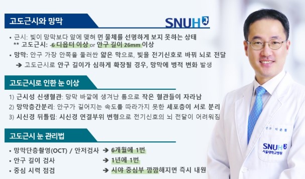 박운철 교수는 “망막은 수많은 시각세포와 혈관으로 구성된 얇은 신경막으로, 약간의 구조적·기능적 변화만으로 시력과 시기능의 장애를 가져올 수 있고, 이는 삶의 질과 직결되므로 많은 관심과 주의가 필요하다”며 “고도근시 외에도 황반변성, 당뇨망막병증, 망막박리 등 다양한 망막질환이 시력 저하를 유발할 수 있지만, 기술의 발달과 신약 개발로 이전과 달리 효과적인 치료가 가능한 경우가 많으므로 시력저하, 시야장애 등의 증상이 있으면 신속한 진료가 필요하다”고 말했다. 이어 “먼지나 작은 벌레가 떠다니는 듯한 비문증, 눈앞이 번쩍거리는 광시증 등도 망막질환의 전조일 수 있어 반드시 확인이 필요하다”며 “눈이 두 개다 보니 종종 본인도 모르는 사이 질환이 발생한 경우가 있는데, 정기적인 안과 검진으로 질환을 조기 발견하고 치료시기를 놓치지 않길 바란다”고 조언했다.