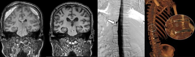 DSM과 더불어 세브란스병원이 함께 진행 중인 측위 컴퓨터단층촬영(CT) 척수조영술까지, 모두 뇌척수액 정맥 누공을 진단할 수 있는 최신 기법이다. 뇌척수액 누출로 위축된 뇌(맨 왼쪽), DSM으로 확인한 누공 위치(세번째), 측위 CT 척수조영술로 확인한 뇌척수액 정맥누공 3D 영상(오른쪽)